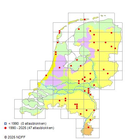 Het aantal atlasblokken (5x5 km) waarin de soort is gemeld binnen een periode van vijf jaar (vanaf 1980) of twintig jaar. Niet gecorrigeerd voor waarnemersinspanning en het aantal doorgegeven waarnemingen kan sterk variëren per periode, dus een trend in verspreiding kan hier niet direct uit worden afgelezen. Het opgegeven jaartal is het eerste jaar van de periode. Bron: gevalideerde waarnemingen uit de NDFF.