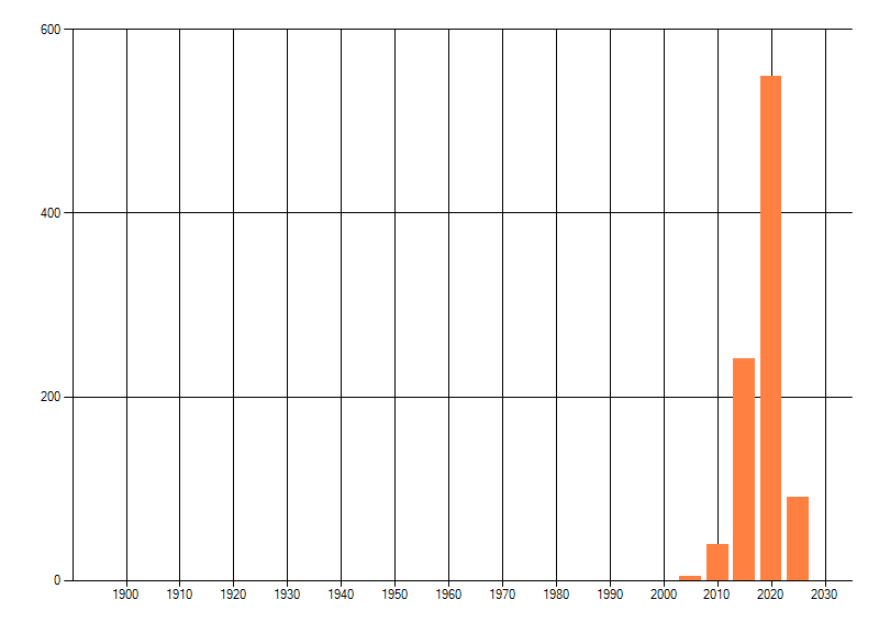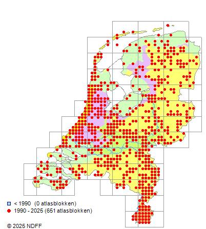 Het aantal atlasblokken (5x5 km) waarin de soort is gemeld binnen een periode van vijf jaar (vanaf 1980) of twintig jaar. Niet gecorrigeerd voor waarnemersinspanning en het aantal doorgegeven waarnemingen kan sterk variëren per periode, dus een trend in verspreiding kan hier niet direct uit worden afgelezen. Het opgegeven jaartal is het eerste jaar van de periode. Bron: gevalideerde waarnemingen uit de NDFF.