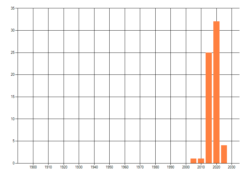 Het aantal atlasblokken (5x5 km) waarin de soort is gemeld binnen een periode van vijf jaar (vanaf 1980) of twintig jaar. Niet gecorrigeerd voor waarnemersinspanning en het aantal doorgegeven waarnemingen kan sterk variëren per periode, dus een trend in verspreiding kan hier niet direct uit worden afgelezen. Het opgegeven jaartal is het eerste jaar van de periode. Bron: gevalideerde waarnemingen uit de NDFF.