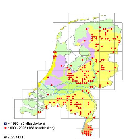 Het aantal atlasblokken (5x5 km) waarin de soort is gemeld binnen een periode van vijf jaar (vanaf 1980) of twintig jaar. Niet gecorrigeerd voor waarnemersinspanning en het aantal doorgegeven waarnemingen kan sterk variëren per periode, dus een trend in verspreiding kan hier niet direct uit worden afgelezen. Het opgegeven jaartal is het eerste jaar van de periode. Bron: gevalideerde waarnemingen uit de NDFF.