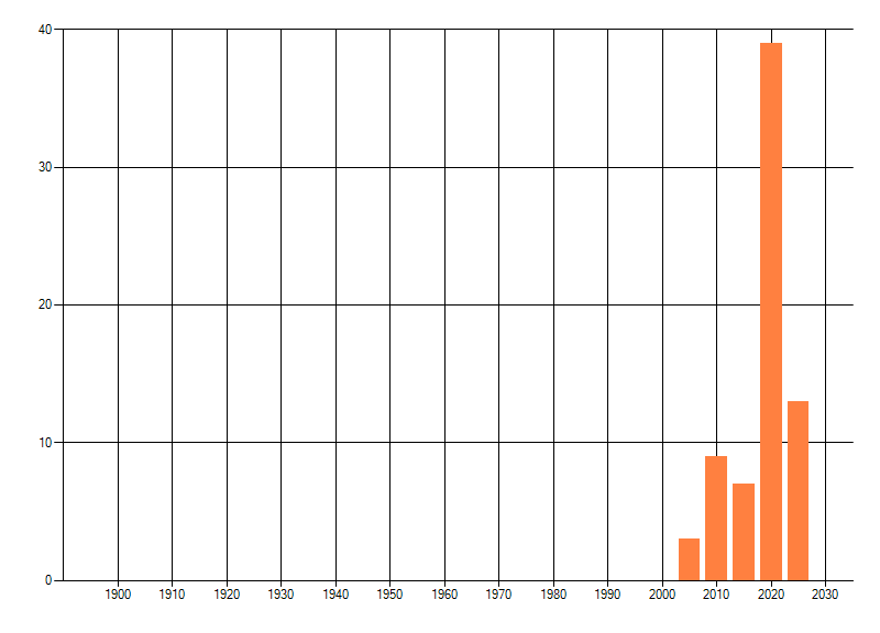 Het aantal atlasblokken (5x5 km) waarin de soort is gemeld binnen een periode van vijf jaar (vanaf 1980) of twintig jaar. Niet gecorrigeerd voor waarnemersinspanning en het aantal doorgegeven waarnemingen kan sterk variëren per periode, dus een trend in verspreiding kan hier niet direct uit worden afgelezen. Het opgegeven jaartal is het eerste jaar van de periode. Bron: gevalideerde waarnemingen uit de NDFF.