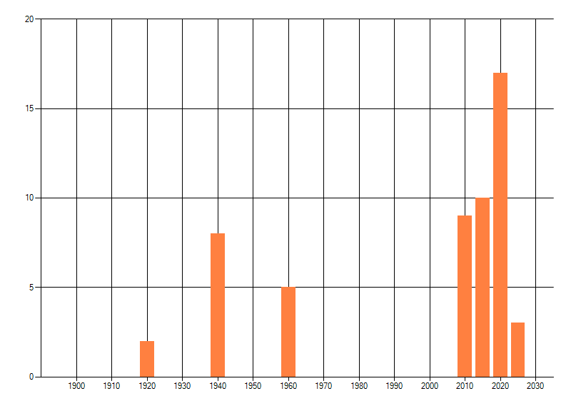Het aantal atlasblokken (5x5 km) waarin de soort is gemeld binnen een periode van vijf jaar (vanaf 1980) of twintig jaar. Niet gecorrigeerd voor waarnemersinspanning en het aantal doorgegeven waarnemingen kan sterk variëren per periode, dus een trend in verspreiding kan hier niet direct uit worden afgelezen. Het opgegeven jaartal is het eerste jaar van de periode. Bron: gevalideerde waarnemingen uit de NDFF.