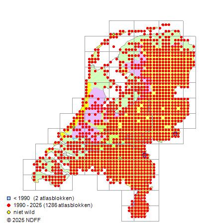 Het aantal atlasblokken (5x5 km) waarin de soort is gemeld binnen een periode van vijf jaar (vanaf 1980) of twintig jaar. Niet gecorrigeerd voor waarnemersinspanning en het aantal doorgegeven waarnemingen kan sterk variëren per periode, dus een trend in verspreiding kan hier niet direct uit worden afgelezen. Het opgegeven jaartal is het eerste jaar van de periode. Bron: gevalideerde waarnemingen uit de NDFF.