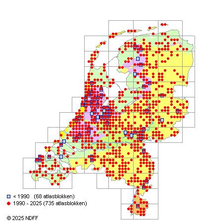 Het aantal atlasblokken (5x5 km) waarin de soort is gemeld binnen een periode van vijf jaar (vanaf 1980) of twintig jaar. Niet gecorrigeerd voor waarnemersinspanning en het aantal doorgegeven waarnemingen kan sterk variëren per periode, dus een trend in verspreiding kan hier niet direct uit worden afgelezen. Het opgegeven jaartal is het eerste jaar van de periode. Bron: gevalideerde waarnemingen uit de NDFF.