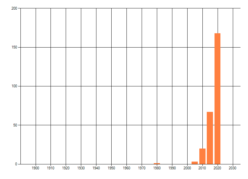 Het aantal atlasblokken (5x5 km) waarin de soort is gemeld binnen een periode van vijf jaar (vanaf 1980) of twintig jaar. Niet gecorrigeerd voor waarnemersinspanning en het aantal doorgegeven waarnemingen kan sterk variëren per periode, dus een trend in verspreiding kan hier niet direct uit worden afgelezen. Het opgegeven jaartal is het eerste jaar van de periode. Bron: gevalideerde waarnemingen uit de NDFF.