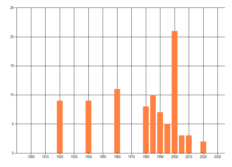 Het aantal atlasblokken (5x5 km) waarin de soort is gemeld binnen een periode van vijf jaar (vanaf 1980) of twintig jaar. Niet gecorrigeerd voor waarnemersinspanning en het aantal doorgegeven waarnemingen kan sterk variëren per periode, dus een trend in verspreiding kan hier niet direct uit worden afgelezen. Het opgegeven jaartal is het eerste jaar van de periode. Bron: gevalideerde waarnemingen uit de NDFF.
