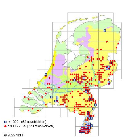 Het aantal atlasblokken (5x5 km) waarin de soort is gemeld binnen een periode van vijf jaar (vanaf 1980) of twintig jaar. Niet gecorrigeerd voor waarnemersinspanning en het aantal doorgegeven waarnemingen kan sterk variëren per periode, dus een trend in verspreiding kan hier niet direct uit worden afgelezen. Het opgegeven jaartal is het eerste jaar van de periode. Bron: gevalideerde waarnemingen uit de NDFF.
