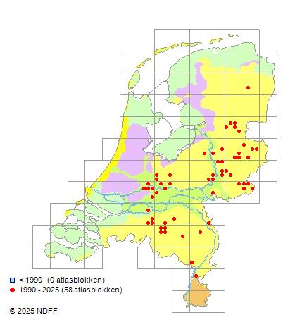 Het aantal atlasblokken (5x5 km) waarin de soort is gemeld binnen een periode van vijf jaar (vanaf 1980) of twintig jaar. Niet gecorrigeerd voor waarnemersinspanning en het aantal doorgegeven waarnemingen kan sterk variëren per periode, dus een trend in verspreiding kan hier niet direct uit worden afgelezen. Het opgegeven jaartal is het eerste jaar van de periode. Bron: gevalideerde waarnemingen uit de NDFF.