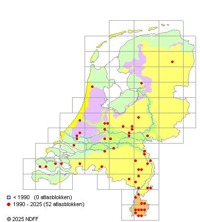 Het aantal atlasblokken (5x5 km) waarin de soort is gemeld binnen een periode van vijf jaar (vanaf 1980) of twintig jaar. Niet gecorrigeerd voor waarnemersinspanning en het aantal doorgegeven waarnemingen kan sterk variëren per periode, dus een trend in verspreiding kan hier niet direct uit worden afgelezen. Het opgegeven jaartal is het eerste jaar van de periode. Bron: gevalideerde waarnemingen uit de NDFF.