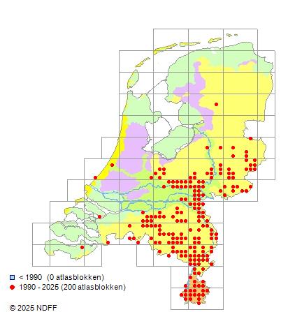 Het aantal atlasblokken (5x5 km) waarin de soort is gemeld binnen een periode van vijf jaar (vanaf 1980) of twintig jaar. Niet gecorrigeerd voor waarnemersinspanning en het aantal doorgegeven waarnemingen kan sterk variëren per periode, dus een trend in verspreiding kan hier niet direct uit worden afgelezen. Het opgegeven jaartal is het eerste jaar van de periode. Bron: gevalideerde waarnemingen uit de NDFF.