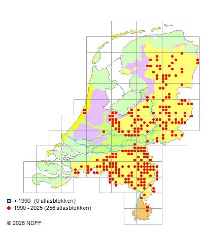 Het aantal atlasblokken (5x5 km) waarin de soort is gemeld binnen een periode van vijf jaar (vanaf 1980) of twintig jaar. Niet gecorrigeerd voor waarnemersinspanning en het aantal doorgegeven waarnemingen kan sterk variëren per periode, dus een trend in verspreiding kan hier niet direct uit worden afgelezen. Het opgegeven jaartal is het eerste jaar van de periode. Bron: gevalideerde waarnemingen uit de NDFF.