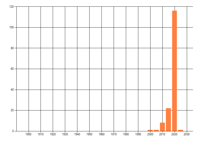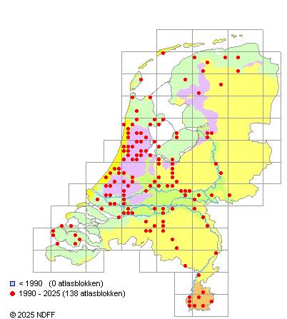 Het aantal atlasblokken (5x5 km) waarin de soort is gemeld binnen een periode van vijf jaar (vanaf 1980) of twintig jaar. Niet gecorrigeerd voor waarnemersinspanning en het aantal doorgegeven waarnemingen kan sterk variëren per periode, dus een trend in verspreiding kan hier niet direct uit worden afgelezen. Het opgegeven jaartal is het eerste jaar van de periode. Bron: gevalideerde waarnemingen uit de NDFF.