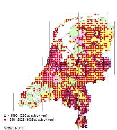 Het aantal atlasblokken (5x5 km) waarin de soort is gemeld binnen een periode van vijf jaar (vanaf 1980) of twintig jaar. Niet gecorrigeerd voor waarnemersinspanning en het aantal doorgegeven waarnemingen kan sterk variëren per periode, dus een trend in verspreiding kan hier niet direct uit worden afgelezen. Het opgegeven jaartal is het eerste jaar van de periode. Bron: gevalideerde waarnemingen uit de NDFF.
