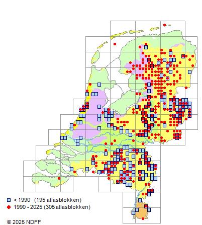Het aantal atlasblokken (5x5 km) waarin de soort is gemeld binnen een periode van vijf jaar (vanaf 1980) of twintig jaar. Niet gecorrigeerd voor waarnemersinspanning en het aantal doorgegeven waarnemingen kan sterk variëren per periode, dus een trend in verspreiding kan hier niet direct uit worden afgelezen. Het opgegeven jaartal is het eerste jaar van de periode. Bron: gevalideerde waarnemingen uit de NDFF.