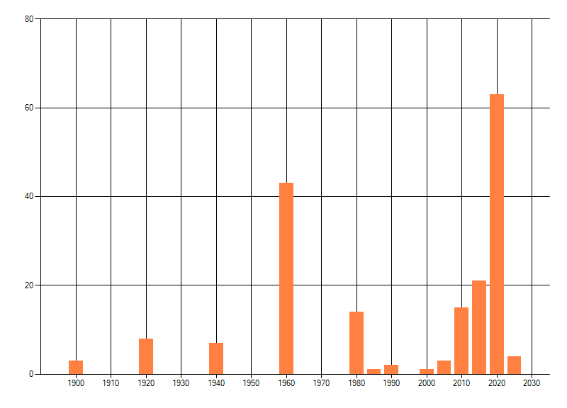 Het aantal atlasblokken (5x5 km) waarin de soort is gemeld binnen een periode van vijf jaar (vanaf 1980) of twintig jaar. Niet gecorrigeerd voor waarnemersinspanning en het aantal doorgegeven waarnemingen kan sterk variëren per periode, dus een trend in verspreiding kan hier niet direct uit worden afgelezen. Het opgegeven jaartal is het eerste jaar van de periode. Bron: gevalideerde waarnemingen uit de NDFF.