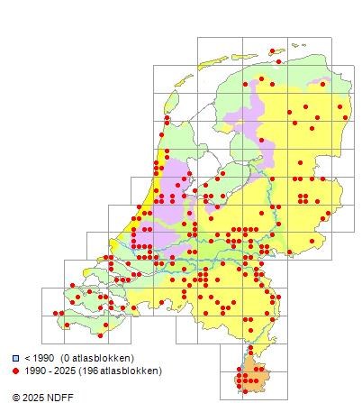 Het aantal atlasblokken (5x5 km) waarin de soort is gemeld binnen een periode van vijf jaar (vanaf 1980) of twintig jaar. Niet gecorrigeerd voor waarnemersinspanning en het aantal doorgegeven waarnemingen kan sterk variëren per periode, dus een trend in verspreiding kan hier niet direct uit worden afgelezen. Het opgegeven jaartal is het eerste jaar van de periode. Bron: gevalideerde waarnemingen uit de NDFF.