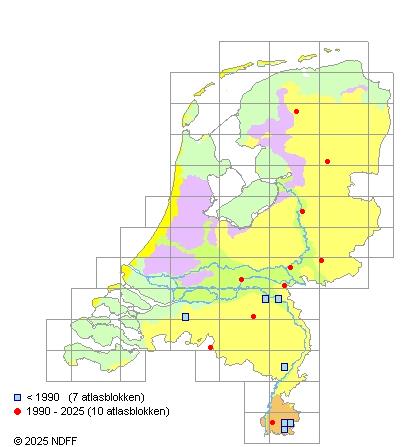 Het aantal atlasblokken (5x5 km) waarin de soort is gemeld binnen een periode van vijf jaar (vanaf 1980) of twintig jaar. Niet gecorrigeerd voor waarnemersinspanning en het aantal doorgegeven waarnemingen kan sterk variëren per periode, dus een trend in verspreiding kan hier niet direct uit worden afgelezen. Het opgegeven jaartal is het eerste jaar van de periode. Bron: gevalideerde waarnemingen uit de NDFF.