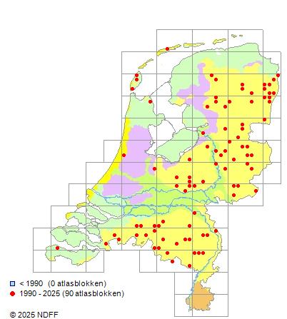 Het aantal atlasblokken (5x5 km) waarin de soort is gemeld binnen een periode van vijf jaar (vanaf 1980) of twintig jaar. Niet gecorrigeerd voor waarnemersinspanning en het aantal doorgegeven waarnemingen kan sterk variëren per periode, dus een trend in verspreiding kan hier niet direct uit worden afgelezen. Het opgegeven jaartal is het eerste jaar van de periode. Bron: gevalideerde waarnemingen uit de NDFF.