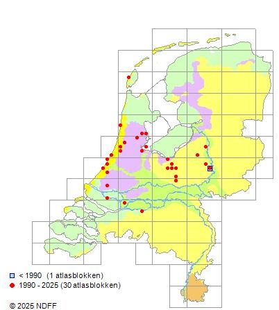 Het aantal atlasblokken (5x5 km) waarin de soort is gemeld binnen een periode van vijf jaar (vanaf 1980) of twintig jaar. Niet gecorrigeerd voor waarnemersinspanning en het aantal doorgegeven waarnemingen kan sterk variëren per periode, dus een trend in verspreiding kan hier niet direct uit worden afgelezen. Het opgegeven jaartal is het eerste jaar van de periode. Bron: gevalideerde waarnemingen uit de NDFF.
