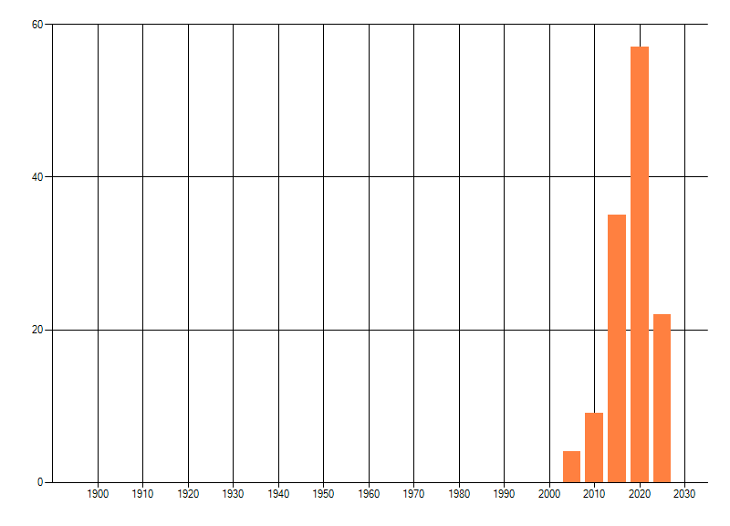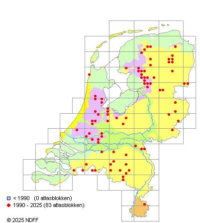 Het aantal atlasblokken (5x5 km) waarin de soort is gemeld binnen een periode van vijf jaar (vanaf 1980) of twintig jaar. Niet gecorrigeerd voor waarnemersinspanning en het aantal doorgegeven waarnemingen kan sterk variëren per periode, dus een trend in verspreiding kan hier niet direct uit worden afgelezen. Het opgegeven jaartal is het eerste jaar van de periode. Bron: gevalideerde waarnemingen uit de NDFF.