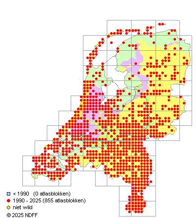 Het aantal atlasblokken (5x5 km) waarin de soort is gemeld binnen een periode van vijf jaar (vanaf 1980) of twintig jaar. Niet gecorrigeerd voor waarnemersinspanning en het aantal doorgegeven waarnemingen kan sterk variëren per periode, dus een trend in verspreiding kan hier niet direct uit worden afgelezen. Het opgegeven jaartal is het eerste jaar van de periode. Bron: gevalideerde waarnemingen uit de NDFF.