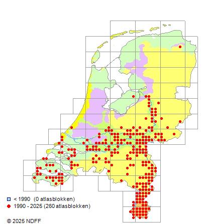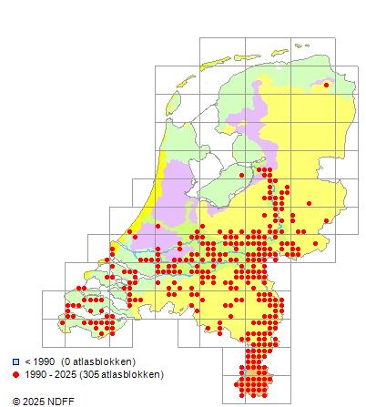 Het aantal atlasblokken (5x5 km) waarin de soort is gemeld binnen een periode van vijf jaar (vanaf 1980) of twintig jaar. Niet gecorrigeerd voor waarnemersinspanning en het aantal doorgegeven waarnemingen kan sterk variëren per periode, dus een trend in verspreiding kan hier niet direct uit worden afgelezen. Het opgegeven jaartal is het eerste jaar van de periode. Bron: gevalideerde waarnemingen uit de NDFF.