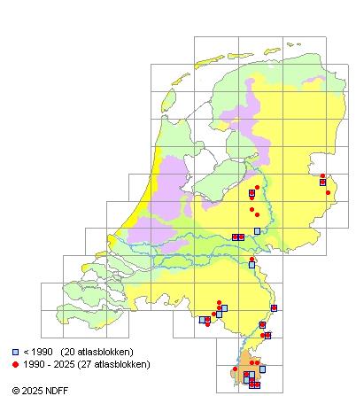 Het aantal atlasblokken (5x5 km) waarin de soort is gemeld binnen een periode van vijf jaar (vanaf 1980) of twintig jaar. Niet gecorrigeerd voor waarnemersinspanning en het aantal doorgegeven waarnemingen kan sterk variëren per periode, dus een trend in verspreiding kan hier niet direct uit worden afgelezen. Het opgegeven jaartal is het eerste jaar van de periode. Bron: gevalideerde waarnemingen uit de NDFF.