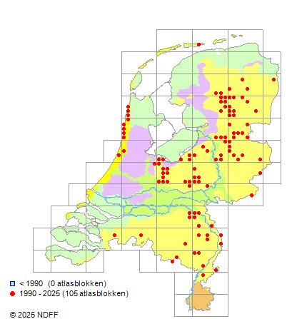 Het aantal atlasblokken (5x5 km) waarin de soort is gemeld binnen een periode van vijf jaar (vanaf 1980) of twintig jaar. Niet gecorrigeerd voor waarnemersinspanning en het aantal doorgegeven waarnemingen kan sterk variëren per periode, dus een trend in verspreiding kan hier niet direct uit worden afgelezen. Het opgegeven jaartal is het eerste jaar van de periode. Bron: gevalideerde waarnemingen uit de NDFF.