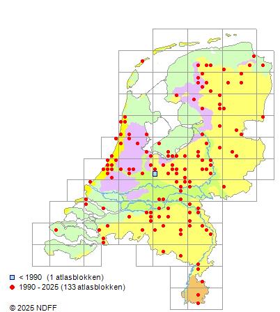 Het aantal atlasblokken (5x5 km) waarin de soort is gemeld binnen een periode van vijf jaar (vanaf 1980) of twintig jaar. Niet gecorrigeerd voor waarnemersinspanning en het aantal doorgegeven waarnemingen kan sterk variëren per periode, dus een trend in verspreiding kan hier niet direct uit worden afgelezen. Het opgegeven jaartal is het eerste jaar van de periode. Bron: gevalideerde waarnemingen uit de NDFF.