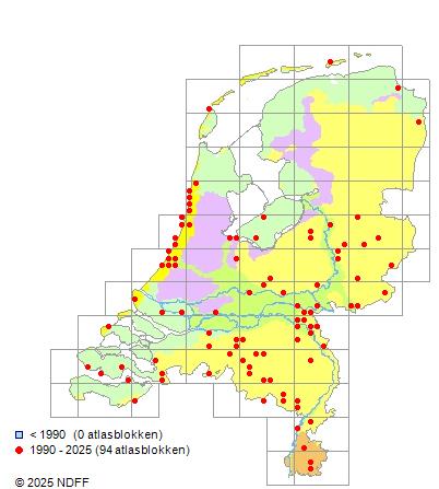 Het aantal atlasblokken (5x5 km) waarin de soort is gemeld binnen een periode van vijf jaar (vanaf 1980) of twintig jaar. Niet gecorrigeerd voor waarnemersinspanning en het aantal doorgegeven waarnemingen kan sterk variëren per periode, dus een trend in verspreiding kan hier niet direct uit worden afgelezen. Het opgegeven jaartal is het eerste jaar van de periode. Bron: gevalideerde waarnemingen uit de NDFF.