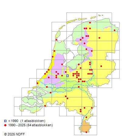 Het aantal atlasblokken (5x5 km) waarin de soort is gemeld binnen een periode van vijf jaar (vanaf 1980) of twintig jaar. Niet gecorrigeerd voor waarnemersinspanning en het aantal doorgegeven waarnemingen kan sterk variëren per periode, dus een trend in verspreiding kan hier niet direct uit worden afgelezen. Het opgegeven jaartal is het eerste jaar van de periode. Bron: gevalideerde waarnemingen uit de NDFF.