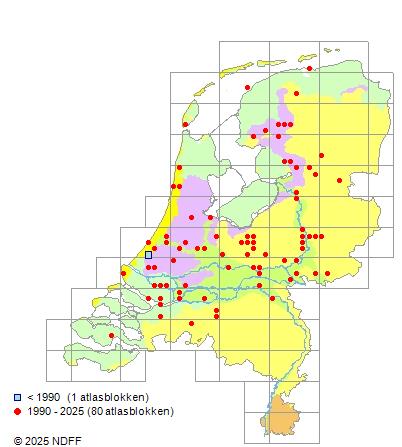 Het aantal atlasblokken (5x5 km) waarin de soort is gemeld binnen een periode van vijf jaar (vanaf 1980) of twintig jaar. Niet gecorrigeerd voor waarnemersinspanning en het aantal doorgegeven waarnemingen kan sterk variëren per periode, dus een trend in verspreiding kan hier niet direct uit worden afgelezen. Het opgegeven jaartal is het eerste jaar van de periode. Bron: gevalideerde waarnemingen uit de NDFF.