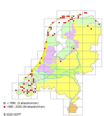 Het aantal atlasblokken (5x5 km) waarin de soort is gemeld binnen een periode van vijf jaar (vanaf 1980) of twintig jaar. Niet gecorrigeerd voor waarnemersinspanning en het aantal doorgegeven waarnemingen kan sterk variëren per periode, dus een trend in verspreiding kan hier niet direct uit worden afgelezen. Het opgegeven jaartal is het eerste jaar van de periode. Bron: gevalideerde waarnemingen uit de NDFF.