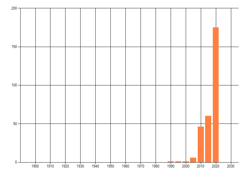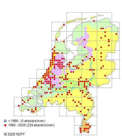 Het aantal atlasblokken (5x5 km) waarin de soort is gemeld binnen een periode van vijf jaar (vanaf 1980) of twintig jaar. Niet gecorrigeerd voor waarnemersinspanning en het aantal doorgegeven waarnemingen kan sterk variëren per periode, dus een trend in verspreiding kan hier niet direct uit worden afgelezen. Het opgegeven jaartal is het eerste jaar van de periode. Bron: gevalideerde waarnemingen uit de NDFF.