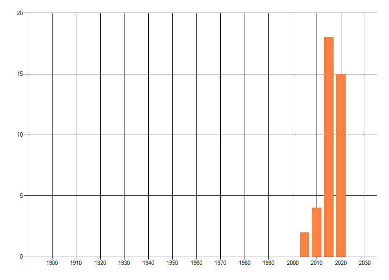 Het aantal atlasblokken (5x5 km) waarin de soort is gemeld binnen een periode van vijf jaar (vanaf 1980) of twintig jaar. Niet gecorrigeerd voor waarnemersinspanning en het aantal doorgegeven waarnemingen kan sterk variëren per periode, dus een trend in verspreiding kan hier niet direct uit worden afgelezen. Het opgegeven jaartal is het eerste jaar van de periode. Bron: gevalideerde waarnemingen uit de NDFF.