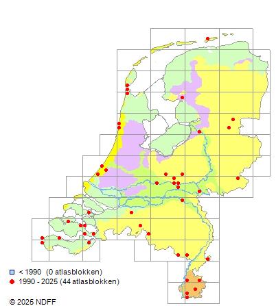 Het aantal atlasblokken (5x5 km) waarin de soort is gemeld binnen een periode van vijf jaar (vanaf 1980) of twintig jaar. Niet gecorrigeerd voor waarnemersinspanning en het aantal doorgegeven waarnemingen kan sterk variëren per periode, dus een trend in verspreiding kan hier niet direct uit worden afgelezen. Het opgegeven jaartal is het eerste jaar van de periode. Bron: gevalideerde waarnemingen uit de NDFF.