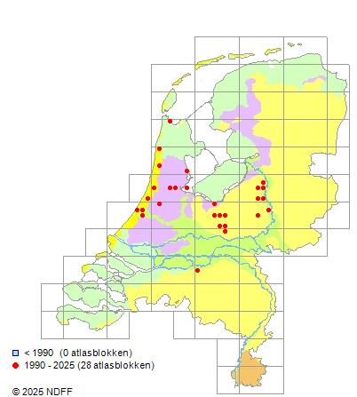 Het aantal atlasblokken (5x5 km) waarin de soort is gemeld binnen een periode van vijf jaar (vanaf 1980) of twintig jaar. Niet gecorrigeerd voor waarnemersinspanning en het aantal doorgegeven waarnemingen kan sterk variëren per periode, dus een trend in verspreiding kan hier niet direct uit worden afgelezen. Het opgegeven jaartal is het eerste jaar van de periode. Bron: gevalideerde waarnemingen uit de NDFF.