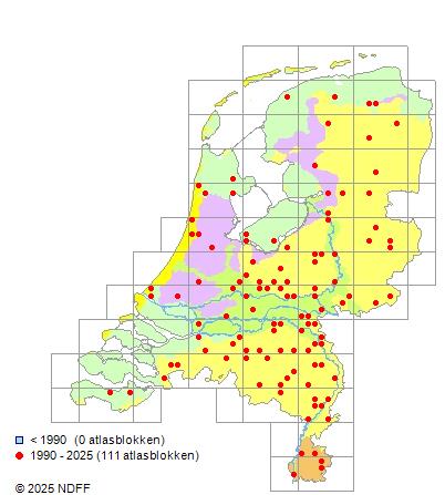 Het aantal atlasblokken (5x5 km) waarin de soort is gemeld binnen een periode van vijf jaar (vanaf 1980) of twintig jaar. Niet gecorrigeerd voor waarnemersinspanning en het aantal doorgegeven waarnemingen kan sterk variëren per periode, dus een trend in verspreiding kan hier niet direct uit worden afgelezen. Het opgegeven jaartal is het eerste jaar van de periode. Bron: gevalideerde waarnemingen uit de NDFF.