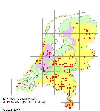 Het aantal atlasblokken (5x5 km) waarin de soort is gemeld binnen een periode van vijf jaar (vanaf 1980) of twintig jaar. Niet gecorrigeerd voor waarnemersinspanning en het aantal doorgegeven waarnemingen kan sterk variëren per periode, dus een trend in verspreiding kan hier niet direct uit worden afgelezen. Het opgegeven jaartal is het eerste jaar van de periode. Bron: gevalideerde waarnemingen uit de NDFF.