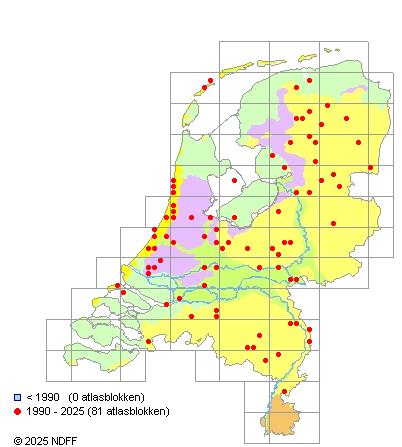 Het aantal atlasblokken (5x5 km) waarin de soort is gemeld binnen een periode van vijf jaar (vanaf 1980) of twintig jaar. Niet gecorrigeerd voor waarnemersinspanning en het aantal doorgegeven waarnemingen kan sterk variëren per periode, dus een trend in verspreiding kan hier niet direct uit worden afgelezen. Het opgegeven jaartal is het eerste jaar van de periode. Bron: gevalideerde waarnemingen uit de NDFF.