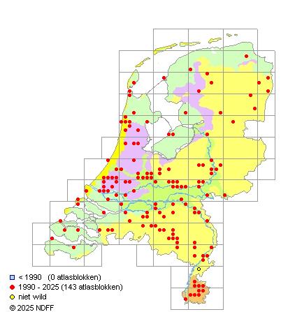 Het aantal atlasblokken (5x5 km) waarin de soort is gemeld binnen een periode van vijf jaar (vanaf 1980) of twintig jaar. Niet gecorrigeerd voor waarnemersinspanning en het aantal doorgegeven waarnemingen kan sterk variëren per periode, dus een trend in verspreiding kan hier niet direct uit worden afgelezen. Het opgegeven jaartal is het eerste jaar van de periode. Bron: gevalideerde waarnemingen uit de NDFF.