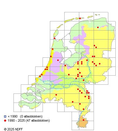 Het aantal atlasblokken (5x5 km) waarin de soort is gemeld binnen een periode van vijf jaar (vanaf 1980) of twintig jaar. Niet gecorrigeerd voor waarnemersinspanning en het aantal doorgegeven waarnemingen kan sterk variëren per periode, dus een trend in verspreiding kan hier niet direct uit worden afgelezen. Het opgegeven jaartal is het eerste jaar van de periode. Bron: gevalideerde waarnemingen uit de NDFF.