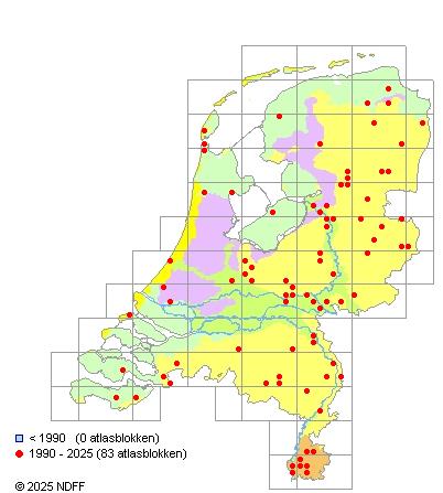Het aantal atlasblokken (5x5 km) waarin de soort is gemeld binnen een periode van vijf jaar (vanaf 1980) of twintig jaar. Niet gecorrigeerd voor waarnemersinspanning en het aantal doorgegeven waarnemingen kan sterk variëren per periode, dus een trend in verspreiding kan hier niet direct uit worden afgelezen. Het opgegeven jaartal is het eerste jaar van de periode. Bron: gevalideerde waarnemingen uit de NDFF.
