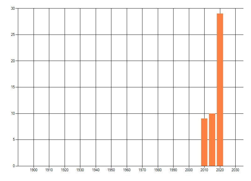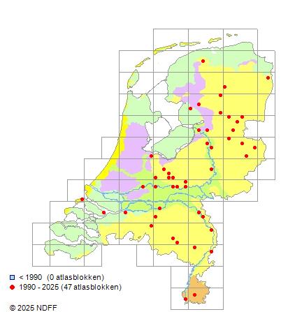 Het aantal atlasblokken (5x5 km) waarin de soort is gemeld binnen een periode van vijf jaar (vanaf 1980) of twintig jaar. Niet gecorrigeerd voor waarnemersinspanning en het aantal doorgegeven waarnemingen kan sterk variëren per periode, dus een trend in verspreiding kan hier niet direct uit worden afgelezen. Het opgegeven jaartal is het eerste jaar van de periode. Bron: gevalideerde waarnemingen uit de NDFF.