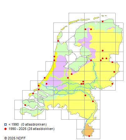 Het aantal atlasblokken (5x5 km) waarin de soort is gemeld binnen een periode van vijf jaar (vanaf 1980) of twintig jaar. Niet gecorrigeerd voor waarnemersinspanning en het aantal doorgegeven waarnemingen kan sterk variëren per periode, dus een trend in verspreiding kan hier niet direct uit worden afgelezen. Het opgegeven jaartal is het eerste jaar van de periode. Bron: gevalideerde waarnemingen uit de NDFF.