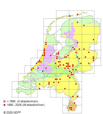 Het aantal atlasblokken (5x5 km) waarin de soort is gemeld binnen een periode van vijf jaar (vanaf 1980) of twintig jaar. Niet gecorrigeerd voor waarnemersinspanning en het aantal doorgegeven waarnemingen kan sterk variëren per periode, dus een trend in verspreiding kan hier niet direct uit worden afgelezen. Het opgegeven jaartal is het eerste jaar van de periode. Bron: gevalideerde waarnemingen uit de NDFF.