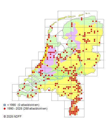 Het aantal atlasblokken (5x5 km) waarin de soort is gemeld binnen een periode van vijf jaar (vanaf 1980) of twintig jaar. Niet gecorrigeerd voor waarnemersinspanning en het aantal doorgegeven waarnemingen kan sterk variëren per periode, dus een trend in verspreiding kan hier niet direct uit worden afgelezen. Het opgegeven jaartal is het eerste jaar van de periode. Bron: gevalideerde waarnemingen uit de NDFF.