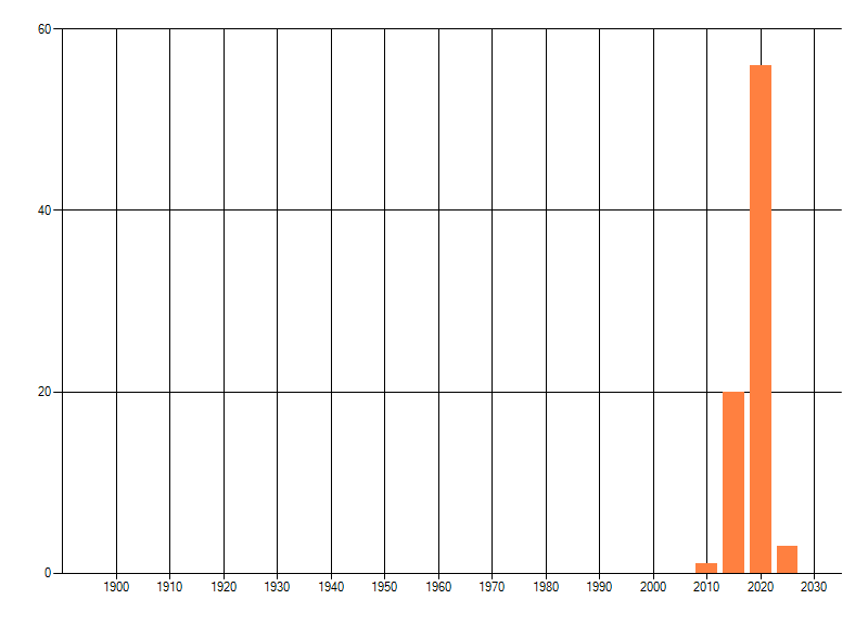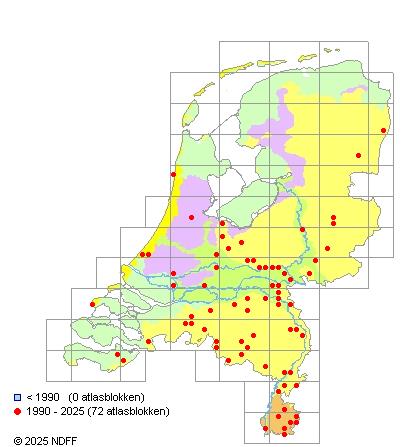 Het aantal atlasblokken (5x5 km) waarin de soort is gemeld binnen een periode van vijf jaar (vanaf 1980) of twintig jaar. Niet gecorrigeerd voor waarnemersinspanning en het aantal doorgegeven waarnemingen kan sterk variëren per periode, dus een trend in verspreiding kan hier niet direct uit worden afgelezen. Het opgegeven jaartal is het eerste jaar van de periode. Bron: gevalideerde waarnemingen uit de NDFF.