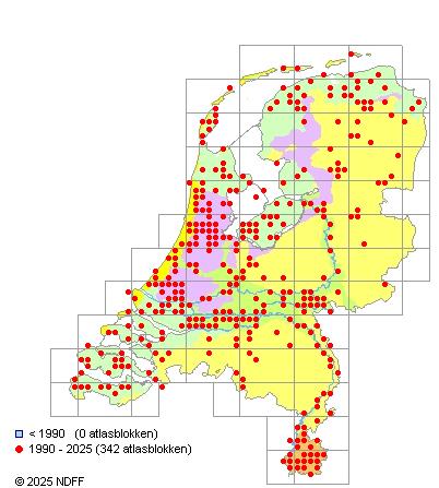 Het aantal atlasblokken (5x5 km) waarin de soort is gemeld binnen een periode van vijf jaar (vanaf 1980) of twintig jaar. Niet gecorrigeerd voor waarnemersinspanning en het aantal doorgegeven waarnemingen kan sterk variëren per periode, dus een trend in verspreiding kan hier niet direct uit worden afgelezen. Het opgegeven jaartal is het eerste jaar van de periode. Bron: gevalideerde waarnemingen uit de NDFF.