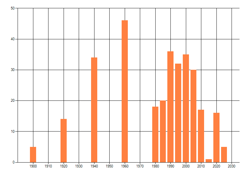 Het aantal atlasblokken (5x5 km) waarin de soort is gemeld binnen een periode van vijf jaar (vanaf 1980) of twintig jaar. Niet gecorrigeerd voor waarnemersinspanning en het aantal doorgegeven waarnemingen kan sterk variëren per periode, dus een trend in verspreiding kan hier niet direct uit worden afgelezen. Het opgegeven jaartal is het eerste jaar van de periode. Bron: gevalideerde waarnemingen uit de NDFF.